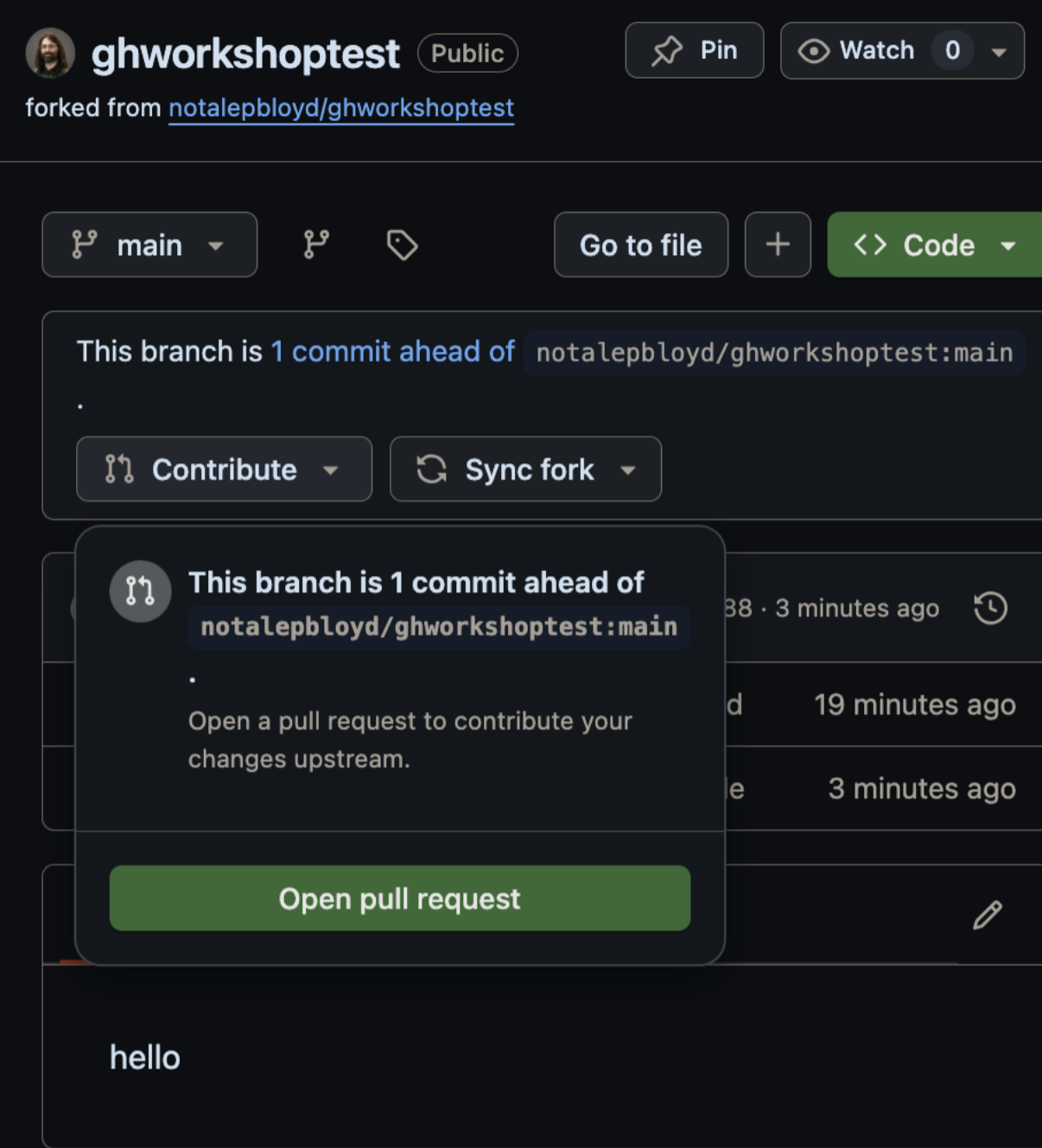 Now if we look at our copy of the code on github, we can see the change that we made - but if we look at the repository that we "forked" - the original repository - our change isn't present there