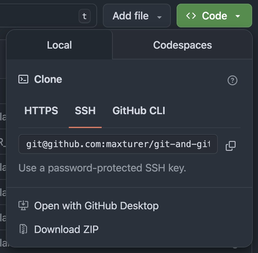 Code. On the "Local" tab, select SSH and copy the provided line.